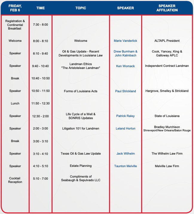 The purpose of the Ark-La-Tex Association of Professional Landmen is to serve as an unincorporated professional organization for men and women engaged for pecuniary gain or profit, but to inspire and maintain a high standard of professional conduct according to a Code of Ethics, to recognition and improved standing for the Landman in the industry and in the community, to provide and promote the furtherance of education and educational opportunities for the personal professional development of all members of the Association, as well as for selected scholarship recipients, if any, and to encourage and promote involvement in local, state, and national issues which affect the mineral and energy industries. The ALTAPL is headquartered in the City of Shreveport, Parish of Caddo, State of Louisiana.